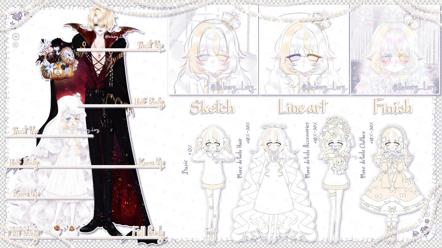 หลังจากจองคิวแล้วโปรดส่งรายละเอียดในส่วนของ ข้อมูล ตัวละคร/OC , ขนาดภาพ , ไฟล์งาน (PNG , JPG) , เสื้อผ้าและสไตล์ , ท่าทาง เพิ่มประเมินราคาและชำระเงิน